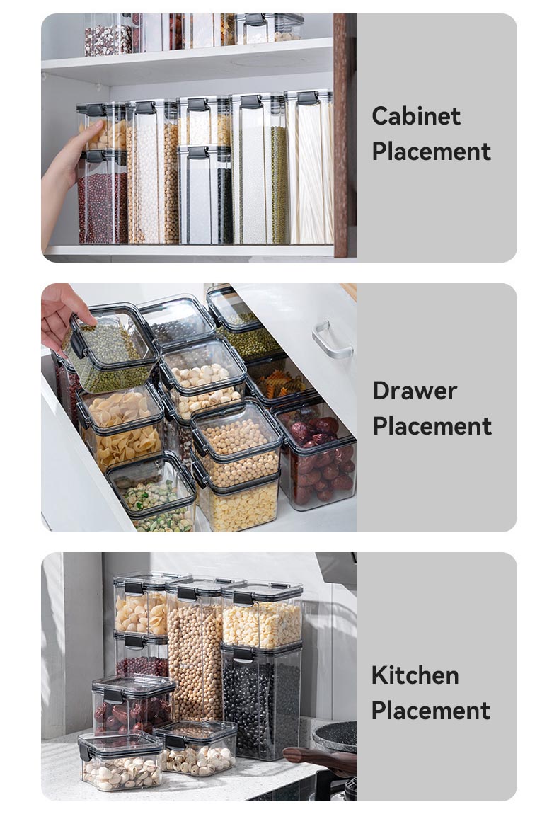Keep your foods fresh with our kitchen essentials for your new home easy to use canisters sets for the kitchen airtight lid-lock mechanism. Our airtight containers for food storage create an airtight seal by simply pushing down the ring on the lid. Lift the ring and push up whenever you want to open the containers.